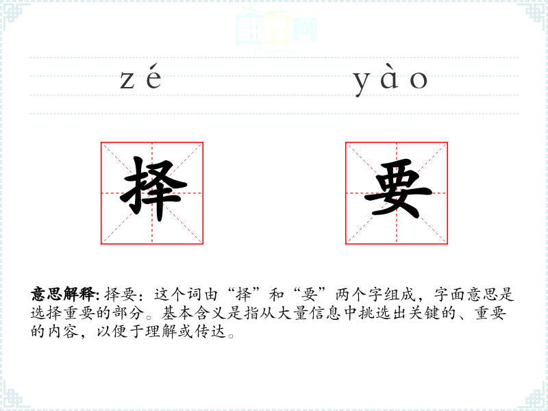 择要:这个词由“择”和“要”两个字组成,字面意思是选择重要的部分。基本含义是指从大量信息中挑选出关键的、重要的内容,以便于理解或传达。
