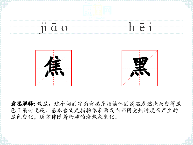 焦黑:这个词的字面意思是指物体因高温或燃烧而变得黑色且质地变硬。基本含义是指物体表面或内部因受热过度而产生的黑色变化,通常伴随着物质的烧焦或炭化。