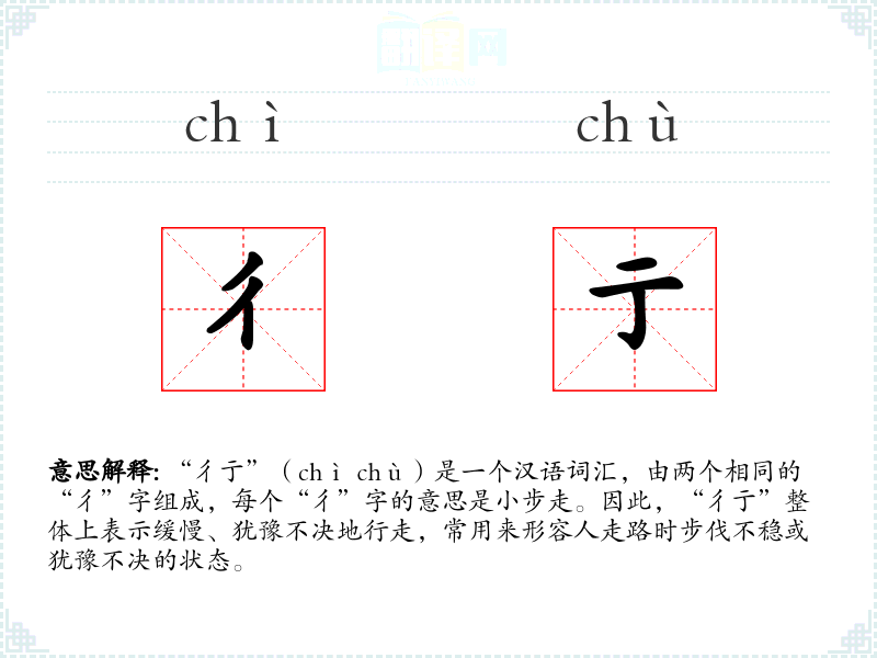 “彳亍”(chì chù)是一个汉语词汇,由两个相同的“彳”字组成,每个“彳”字的意思是小步走。因此,“彳亍”整体上表示缓慢、犹豫不决地行走,常用来形容人走路时步伐不稳或犹豫不决的状态。