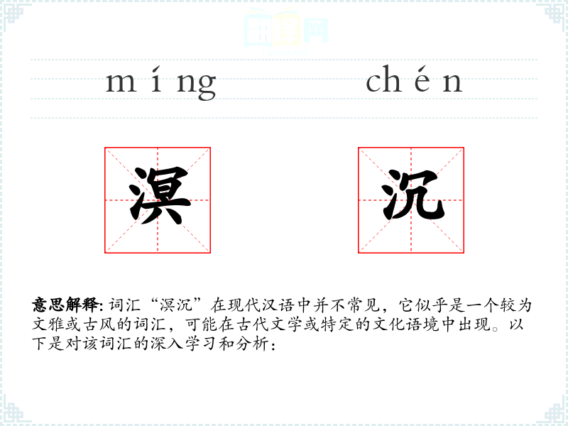 词汇“溟沉”在现代汉语中并不常见,它似乎是一个较为文雅或古风的词汇,可能在古代文学或特定的文化语境中出现。以下是对该词汇的深入学习和分析: