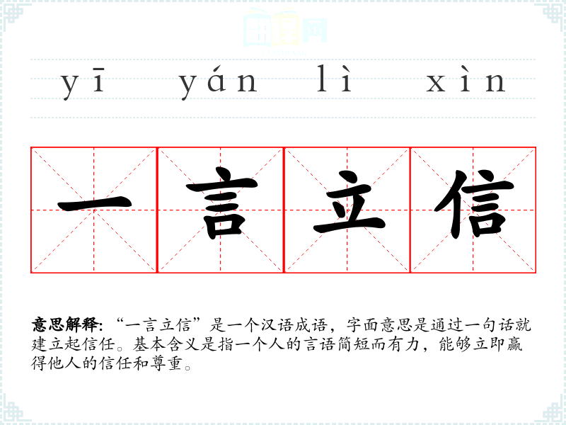 “一言立信”是一个汉语成语,字面意思是通过一句话就建立起信任。基本含义是指一个人的言语简短而有力,能够立即赢得他人的信任和尊重。