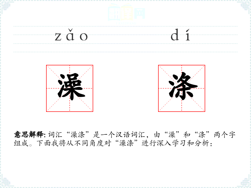 词汇“澡涤”是一个汉语词汇,由“澡”和“涤”两个字组成。下面我将从不同角度对“澡涤”进行深入学*和分析: