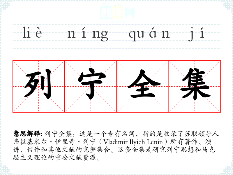 列宁全集:这是一个专有名词,指的是收录了苏联领导人弗拉基米尔·伊里奇·列宁(Vladimir Ilyich Lenin)所有著作、演讲、信件和其他文献的完整集合。这套全集是研究列宁思想和马克思主义理论的重要文献资源。