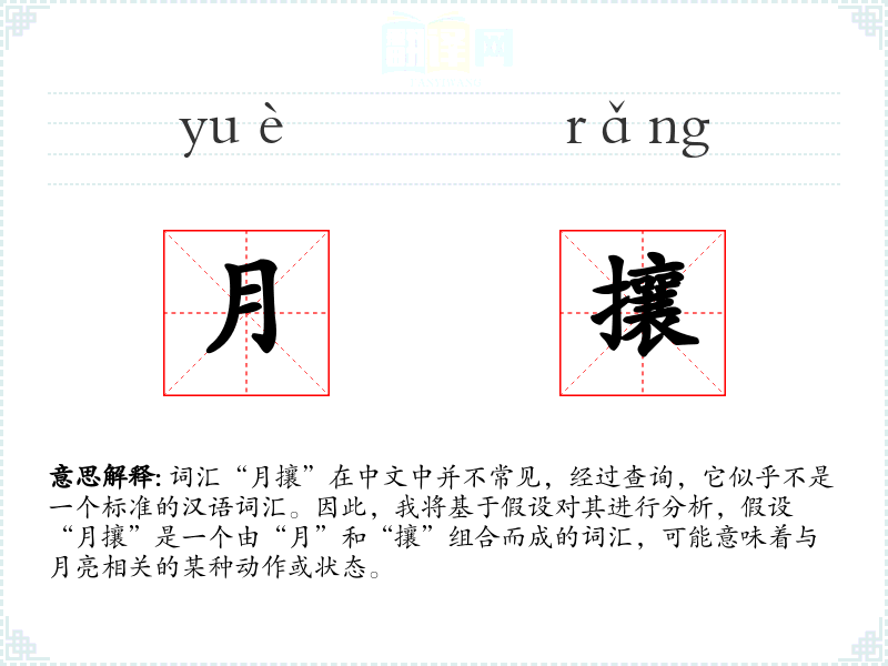 - 字面意思:结合“月”(月亮)和“攘”(可能指排斥、驱赶),“月攘”可能指的是与月亮相关的排斥或驱赶动作。