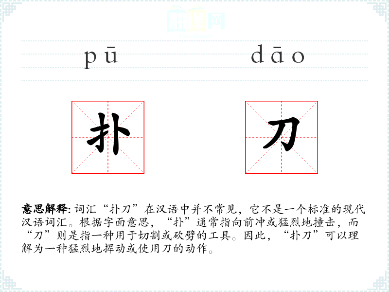 “扑刀”的字面意思是指用刀猛烈地砍或劈的动作。