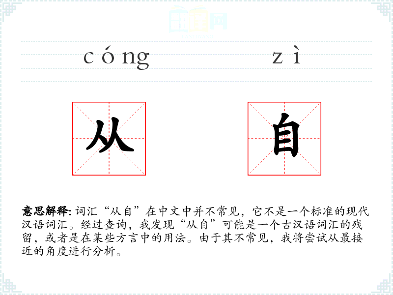 词汇“从自”在中文中并不常见,它不是一个标准的现代汉语词汇。经过查询,我发现“从自”可能是一个古汉语词汇的残留,或者是在某些方言中的用法。由于其不常见,我将尝试从最接近的角度进行分析。