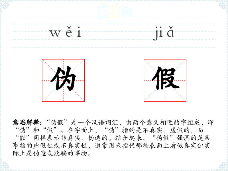 “伪假”是一个汉语词汇,由两个意义相近的字组成,即“伪”和“假”。在字面上,“伪”指的是不真实、虚假的,而“假”同样表示非真实、伪造的。结合起来,“伪假”强调的是某事物的虚假性或不真实性,通常用来指代那些表面上看似真实但实际上是伪造或欺骗的事物。
