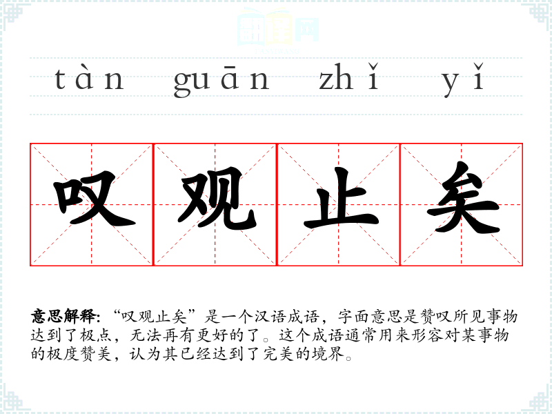 “叹观止矣”是一个汉语成语,字面意思是赞叹所见事物达到了极点,无法再有更好的了。这个成语通常用来形容对某事物的极度赞美,认为其已经达到了完美的境界。