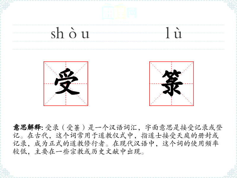 受录(受箓)是一个汉语词汇,字面意思是接受记录或登记。在古代,这个词常用于道教仪式中,指道士接受天庭的册封或记录,成为正式的道教修行者。在现代汉语中,这个词的使用频率较低,主要在一些**或历史文献中出现。