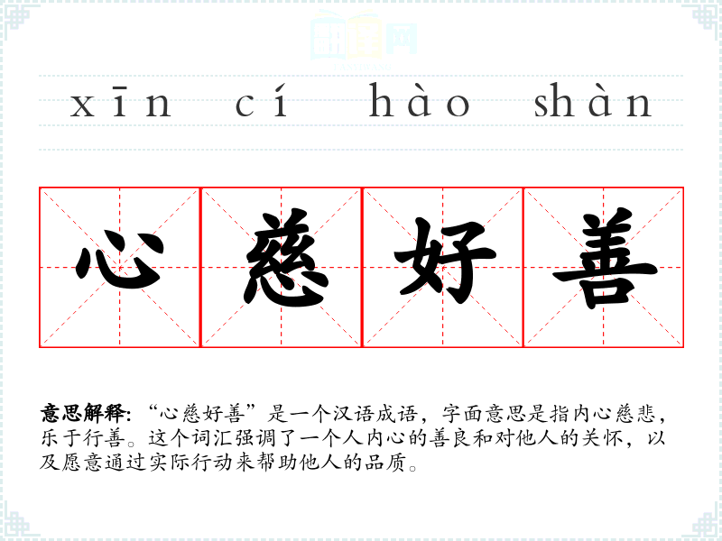 “心慈好善”是一个汉语成语,字面意思是指内心慈悲,乐于行善。这个词汇强调了一个人内心的善良和对他人的关怀,以及愿意通过实际行动来帮助他人的品质。