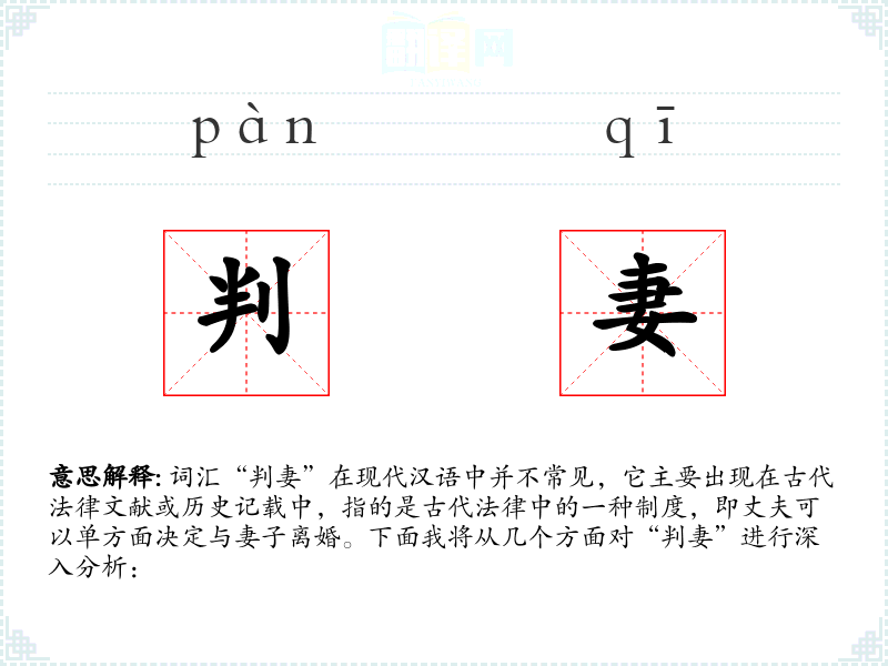 词汇“判妻”在现代汉语中并不常见,它主要出现在古代法律文献或历史记载中,指的是古代法律中的一种制度,即丈夫可以单方面决定与妻子离婚。下面我将从几个方面对“判妻”进行深入分析: