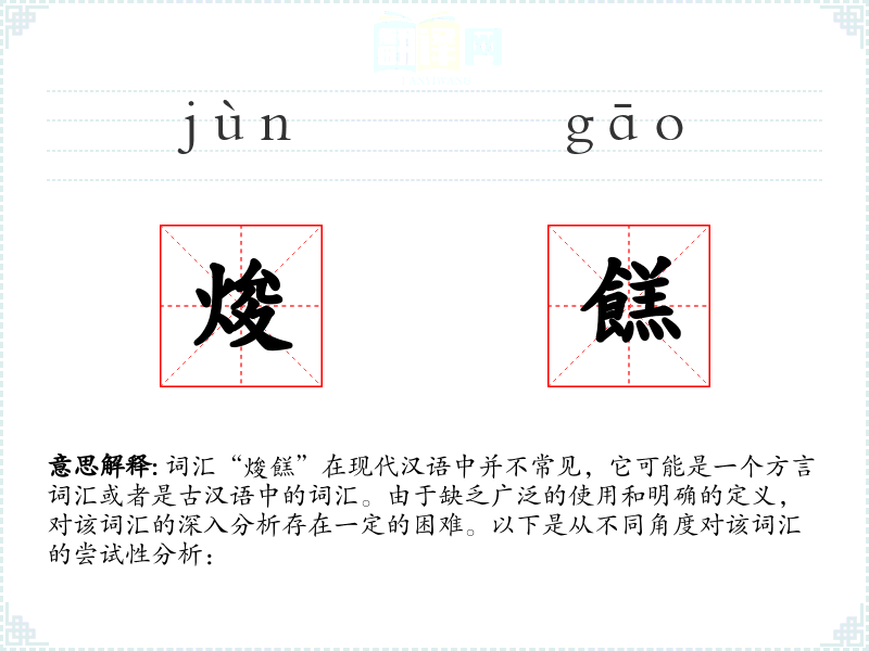 综上所述,由于“焌餻”不是一个常见的汉语词汇,对其进行深入分析存在一定的困难。如果需要更准确的分析,可能需要结合具体的方言资料或古籍文献来进一步研究。