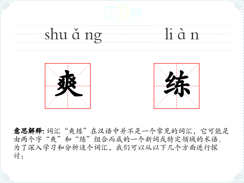 词汇“爽练”在汉语中并不是一个常见的词汇,它可能是由两个字“爽”和“练”组合而成的一个新词或特定领域的术语。为了深入学*和分析这个词汇,我们可以从以下几个方面进行探讨: