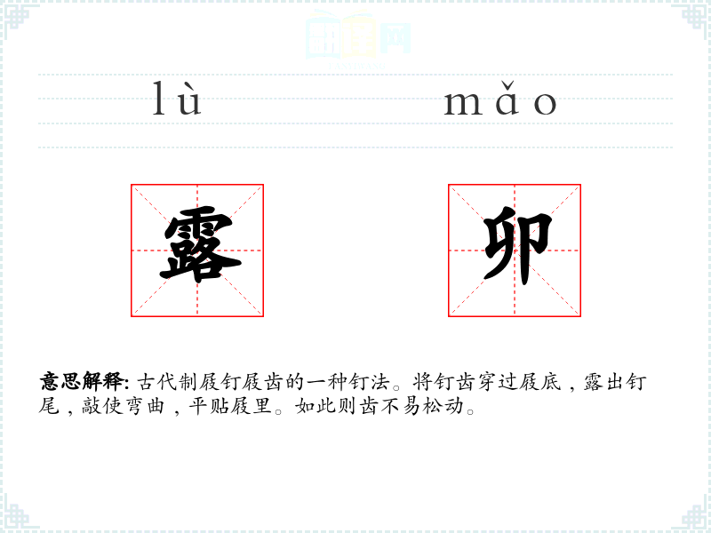 古代制屐钉屐齿的一种钉法。将钉齿穿过屐底﹐露出钉尾﹐敲使弯曲﹐平贴屐里。如此则齿不易松动。