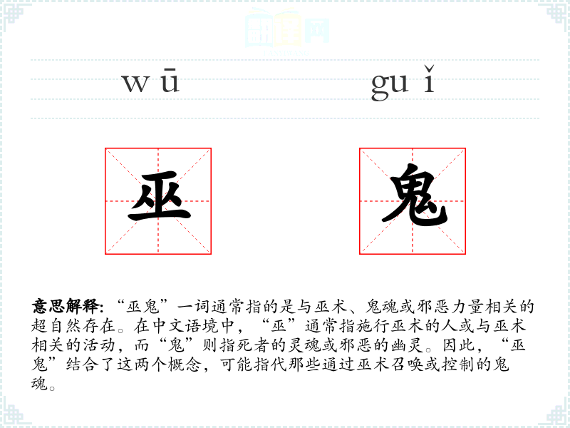 “巫鬼”一词通常指的是与巫术、鬼魂或邪恶力量相关的超自然存在。在中文语境中,“巫”通常指施行巫术的人或与巫术相关的活动,而“鬼”则指死者的灵魂或邪恶的幽灵。因此,“巫鬼”结合了这两个概念,可能指代那些通过巫术召唤或控制的鬼魂。
