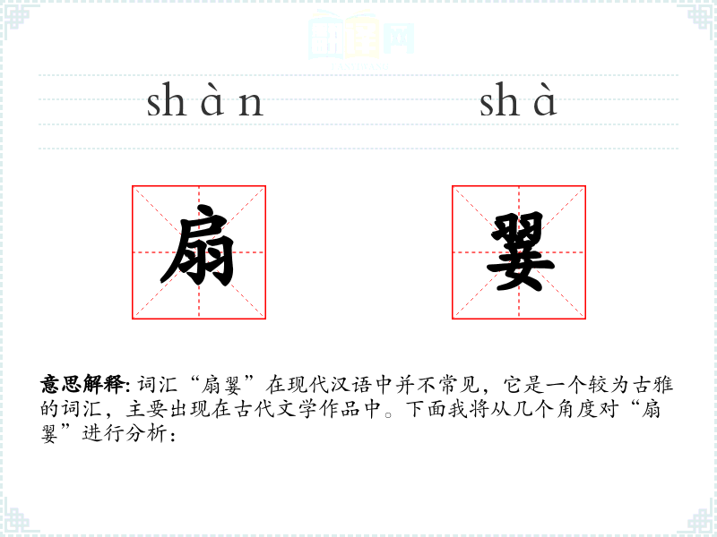 “扇翣”(shàn shà)是一个复合词,由“扇”和“翣”两个字组成。其中,“扇”指的是扇子,一种用来扇风或作为装饰品的物品;“翣”在古代指的是一种大扇子,通常由宫廷中的侍从手持,用以遮阳或作为仪仗。因此,“扇翣”可以理解为一种大型的、用于仪式或礼仪场合的扇子。