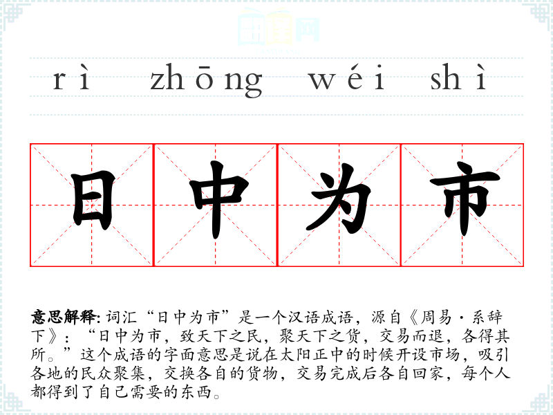 词汇“日中为市”是一个汉语成语,源自《周易·系辞下》:“日中为市,致天下之民,聚天下之货,交易而退,各得其所。”这个成语的字面意思是说在太阳正中的时候开设市场,吸引各地的民众聚集,交换各自的货物,交易完成后各自回家,每个人都得到了自己需要的东西。