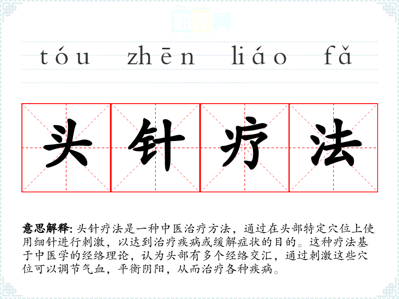 在专业领域,如中医学、针灸学中,“头针疗法”是一个专业术语,用于描述一种特定的治疗方法。在口语或文学作品中,这个词汇可能不太常见,但如果提及,通常会伴随着对中医文化的介绍或探讨。