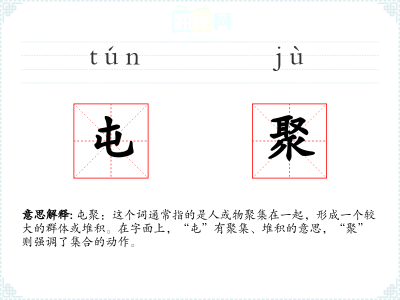 屯聚:这个词通常指的是人或物聚集在一起,形成一个较大的群体或堆积。在字面上,“屯”有聚集、堆积的意思,“聚”则强调了集合的动作。