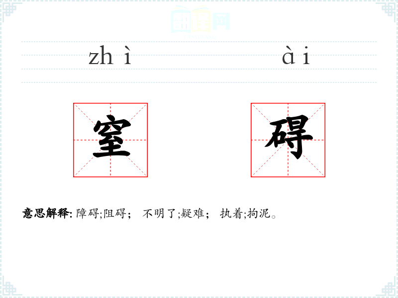 障碍;阻碍; 不明了;疑难; 执着;拘泥。