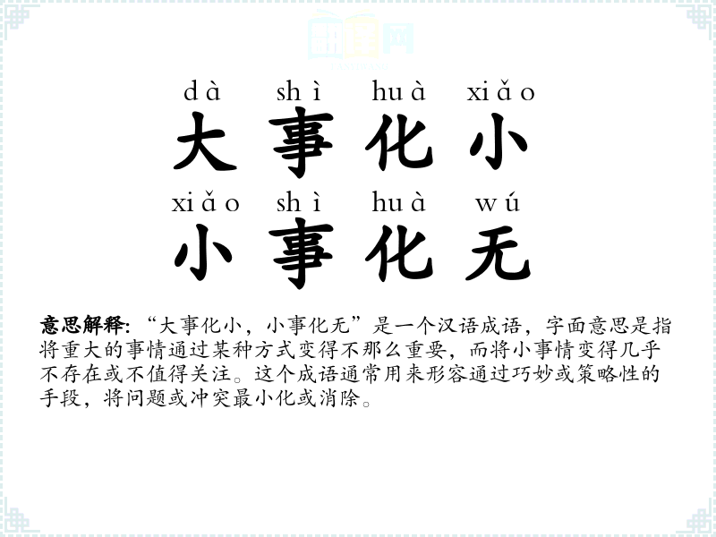 “大事化小,小事化无”是一个汉语成语,字面意思是指将重大的事情通过某种方式变得不那么重要,而将小事情变得几乎不存在或不值得关注。这个成语通常用来形容通过巧妙或策略性的手段,将问题或冲突最小化或消除。