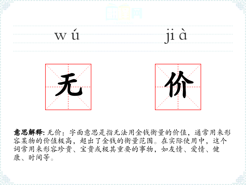 无价:字面意思是指无法用金钱衡量的价值,通常用来形容某物的价值极高,超出了金钱的衡量范围。在实际使用中,这个词常用来形容珍贵、宝贵或极其重要的事物,如友情、爱情、健康、时间等。
