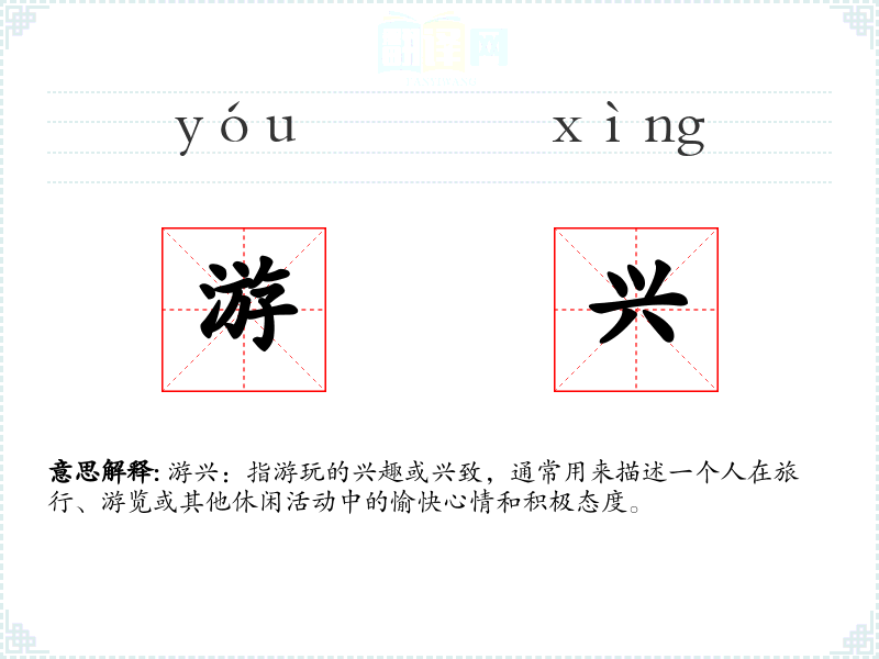 游兴:指游玩的兴趣或兴致,通常用来描述一个人在旅行、游览或其他休闲活动中的愉快心情和积极态度。