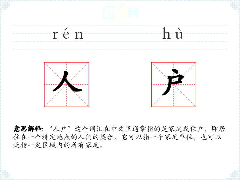 “人户”这个词由“人”和“户”两个字组成,其中“人”指个体,“户”指家庭或门第。这个词在中文中的使用历史悠久,基本含义没有太大变化。