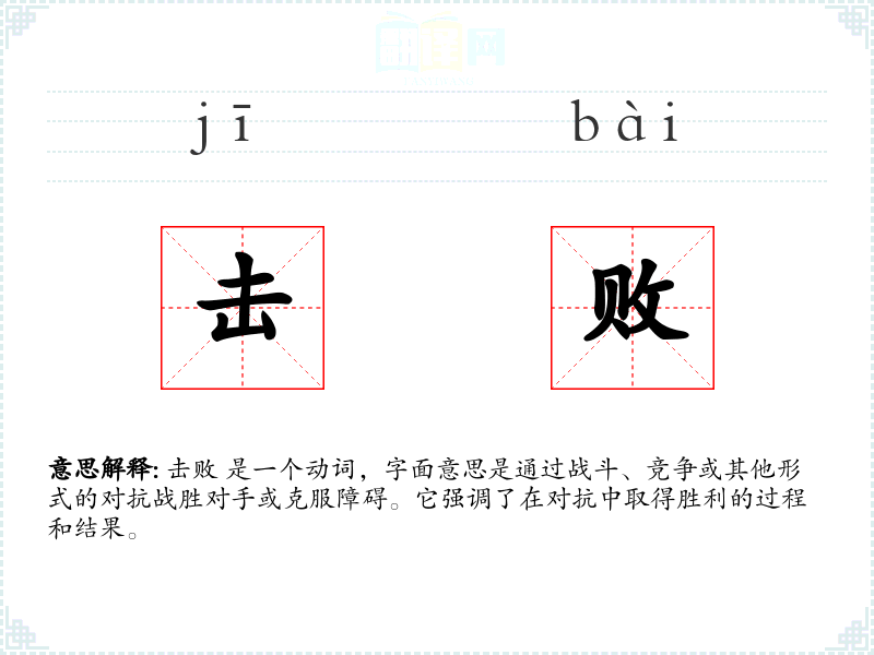 击败 是一个动词,字面意思是通过战斗、竞争或其他形式的对抗战胜对手或克服障碍。它强调了在对抗中取得胜利的过程和结果。