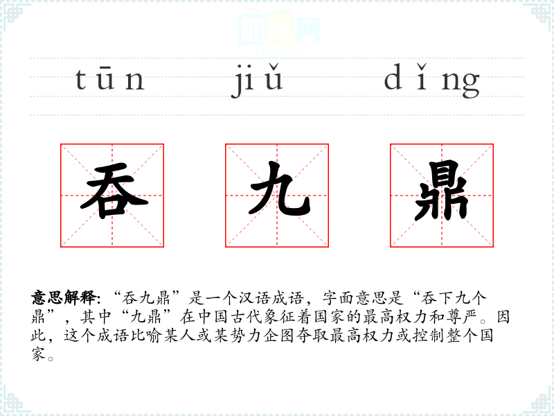 在文学作品中,“吞九鼎”常用来形容野心勃勃的人物或势力,如历史小说中描述权臣或叛军企图篡位的情节。在口语中,这个成语可能不太常用,但在讨论政治或历史话题时,可能会被提及。在专业领域,如历史学或政治学,这个成语用于分析权力斗争和政治野心。