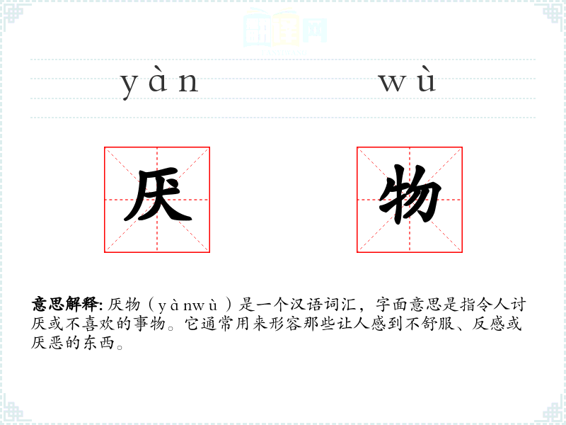 厌物(yànwù)是一个汉语词汇,字面意思是指令人讨厌或不喜欢的事物。它通常用来形容那些让人感到不舒服、反感或厌恶的东西。