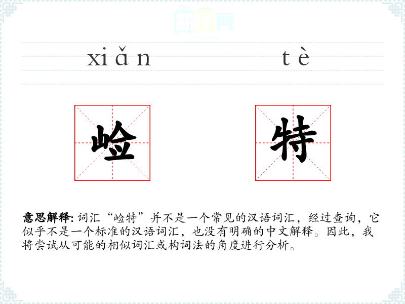 词汇“崄特”并不是一个常见的汉语词汇,经过查询,它似乎不是一个标准的汉语词汇,也没有明确的中文解释。因此,我将尝试从可能的相似词汇或构词法的角度进行分析。