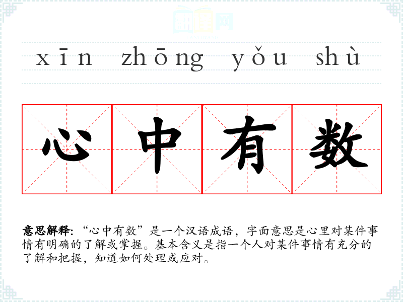 “心中有数”是一个汉语成语,字面意思是心里对某件事情有明确的了解或掌握。基本含义是指一个人对某件事情有充分的了解和把握,知道如何处理或应对。