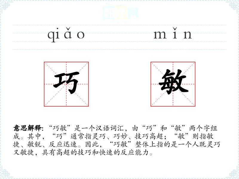 “巧”字最早见于甲骨文,原意为技巧、技艺。“敏”字则源于古代汉语,原意为迅速、敏捷。两个字组合成“巧敏”,强调了技巧与速度的结合,随着时间的推移,这个词在现代汉语中被广泛使用,特别是在形容人的能力和技能时。
