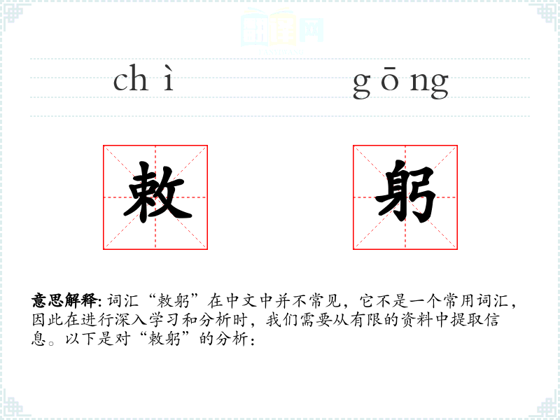词汇“敕躬”在中文中并不常见,它不是一个常用词汇,因此在进行深入学*和分析时,我们需要从有限的资料中提取信息。以下是对“敕躬”的分析: