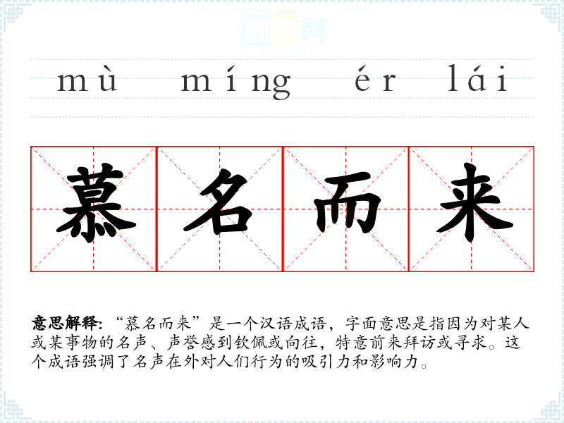 在文化中,名声和声誉一直被视为重要的社会资本。因此,“慕名而来”这个成语在社会中具有深厚的文化基础,反映了人们对优秀事物的追求和尊重。