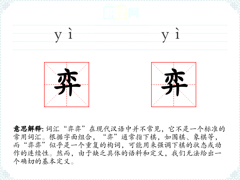 词汇“弈弈”在现代汉语中并不常见,它不是一个标准的常用词汇。根据字面组合,“弈”通常指下棋,如围棋、象棋等,而“弈弈”似乎是一个重复的构词,可能用来强调下棋的状态或动作的连续性。然而,由于缺乏具体的语料和定义,我们无法给出一个确切的基本定义。