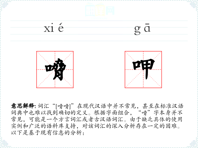 综上所述,词汇“[嗋嗋]”在现代汉语中并不常见,缺乏具体的使用实例和广泛的语料库支持,因此对其进行深入分析存在一定的困难。如果该词汇确实存在并被使用,可能需要更多的语料和文献支持来进行深入研究。