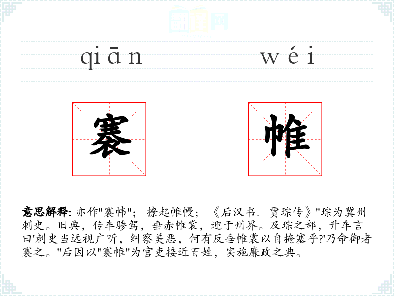 1.亦作"褰帏"; 撩起帷幔; 《后汉书.贾琮传》"琮为冀州刺史。旧典,传车骖驾,垂赤帷裳,迎于州界。及琮之部,升车言曰'刺史当远视广听,纠察美恶,何有反垂帷裳以自掩塞乎?'乃命御者褰之。"后因以"褰帷"为官吏接近百姓,实施廉政之典。