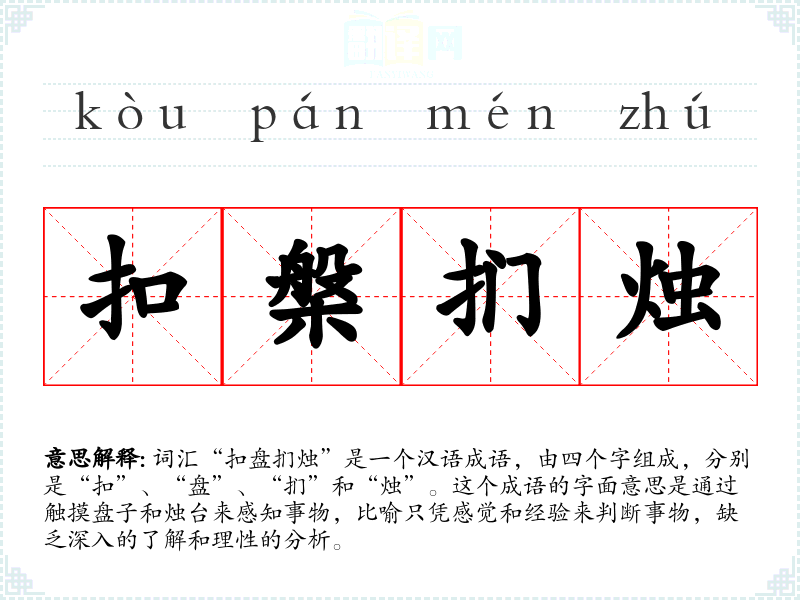 “扣盘扪烛”字面意思是通过触摸盘子和烛台来感知事物,比喻只凭感觉和经验来判断事物,缺乏深入的了解和理性的分析。
