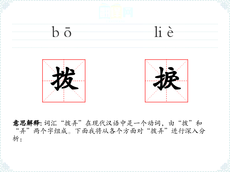 词汇“拨弄”在现代汉语中是一个动词,由“拨”和“弄”两个字组成。下面我将从各个方面对“拨弄”进行深入分析: