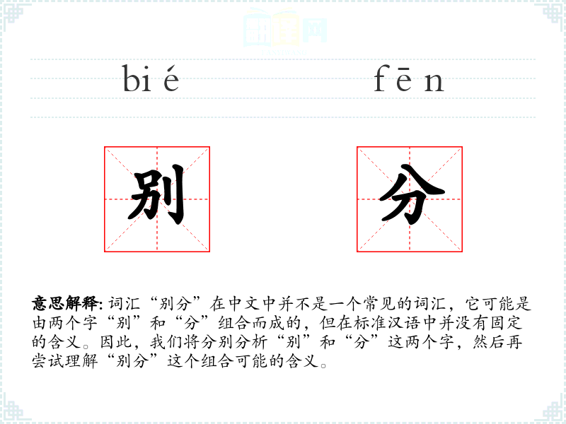 词汇“别分”在中文中并不是一个常见的词汇,它可能是由两个字“别”和“分”组合而成的,但在标准汉语中并没有固定的含义。因此,我们将分别分析“别”和“分”这两个字,然后再尝试理解“别分”这个组合可能的含义。