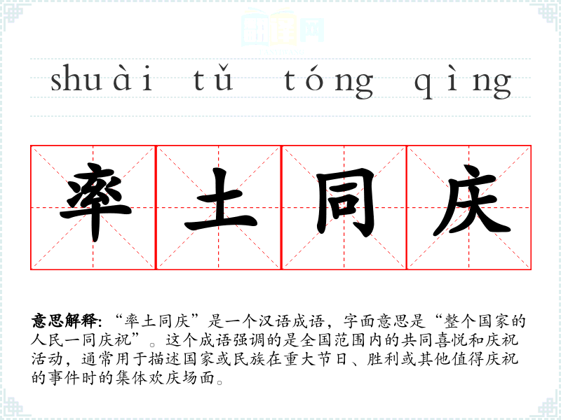 在**文化中,集体主义和团结是非常重要的价值观。因此,“率土同庆”这个成语不仅描述了一个物理上的全国庆祝活动,也象征着民族团结和共同目标的实现。