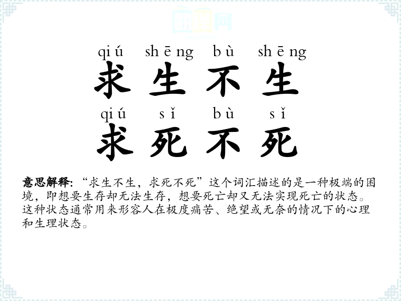 “求生不生,求死不死”这个词汇描述的是一种极端的困境,即想要生存却无法生存,想要死亡却又无法实现死亡的状态。这种状态通常用来形容人在极度痛苦、绝望或无奈的情况下的心理和生理状态。