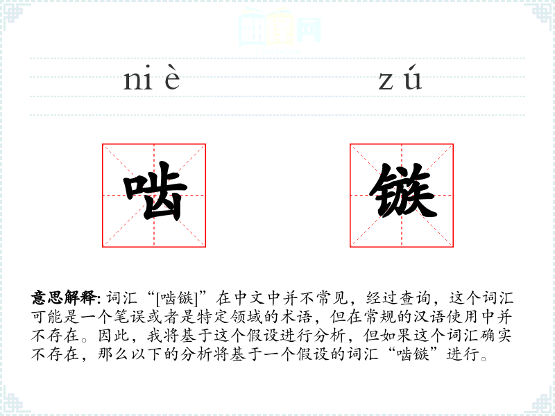 词汇“[啮镞]”在中文中并不常见,经过查询,这个词汇可能是一个笔误或者是特定领域的术语,但在常规的汉语使用中并不存在。因此,我将基于这个假设进行分析,但如果这个词汇确实不存在,那么以下的分析将基于一个假设的词汇“啮镞”进行。