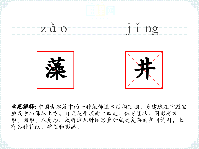 中国古建筑中的一种装饰性木结构顶棚。多建造在宫殿宝座或寺庙佛坛上方。自天花平顶向上凹进,似穹隆状。图形有方形、圆形、八角形,或将这几种图形叠加成更复杂的空间构图,上有各种花纹、雕刻和彩画。