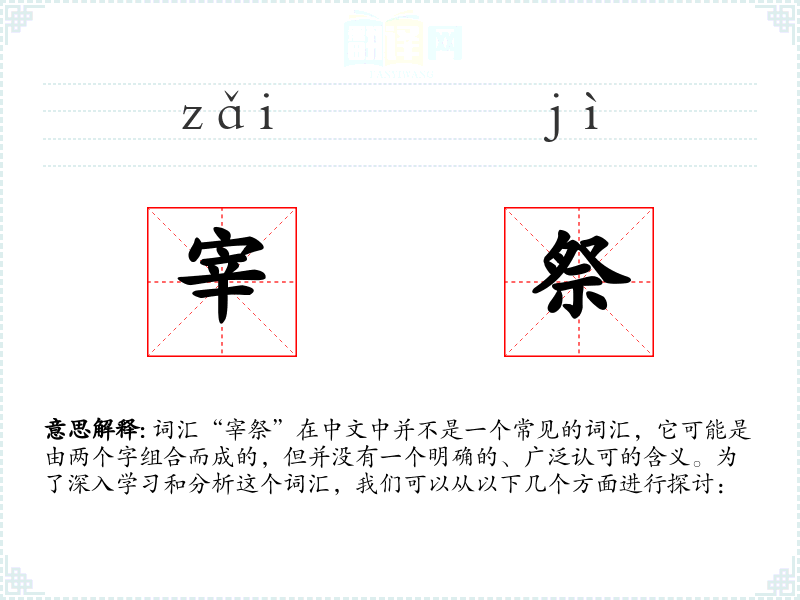 综上所述,“宰祭”并不是一个标准的、有明确含义的词汇,因此在进行深入学习和分析时,我们无法提供具体的内容和例证。在语言学习中,我们应该关注那些有明确含义和广泛使用的词汇,以便更好地理解和运用语言。