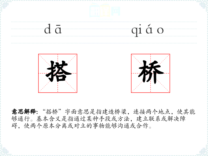 “搭桥”字面意思是指建造桥梁,连接两个地点,使其能够通行。基本含义是指通过某种手段或方法,建立联系或解决障碍,使两个原本分离或对立的事物能够沟通或合作。