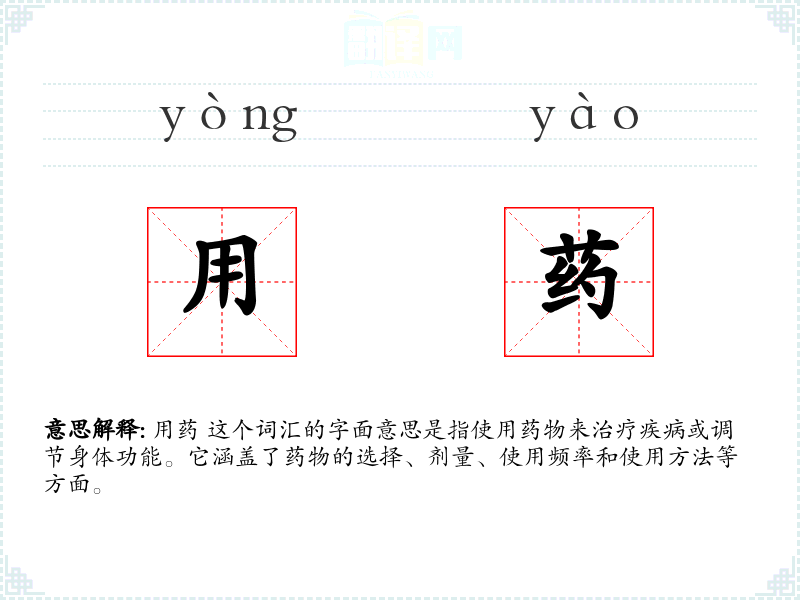用药 这个词汇的字面意思是指使用药物来治疗疾病或调节身体功能。它涵盖了药物的选择、剂量、使用频率和使用方法等方面。