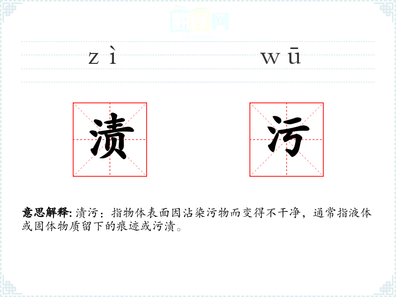 渍污:指物体表面因沾染污物而变得不干净,通常指液体或固体物质留下的痕迹或污渍。